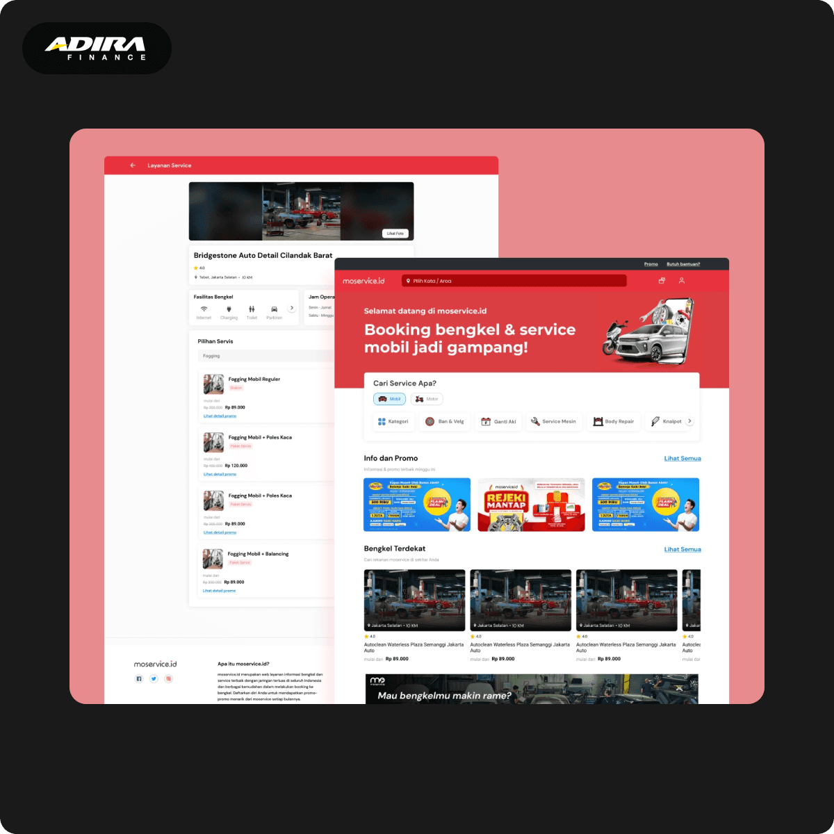 moservice.id is a comprehensive platform by Adira Finance, designed to provide exceptional car servicing experiences and enhance the automotive ecosystem of momobil.id, momotor.id, & Adiraku. By utilizing moservice.id, users can effortlessly schedule appointments for their car or motorcycle services online, eliminating the need for prolonged waiting times at the workshop. my primary role involves executing a website revamp aimed at elevating its user-friendliness and, ideally, driving increased sales on moservice.id