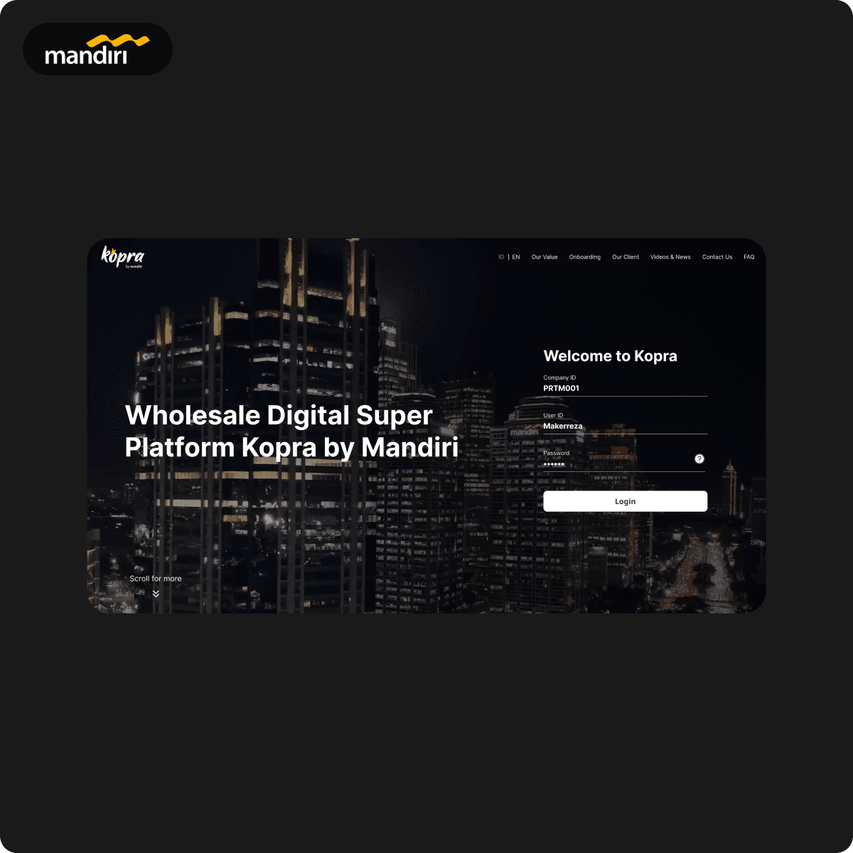 Kopra by Mandiri is Bank Mandiri’s comprehensive wholesale banking service, designed to cater to your business transactions needs for Cash Management, Value Chain and Trade all within a single portal.