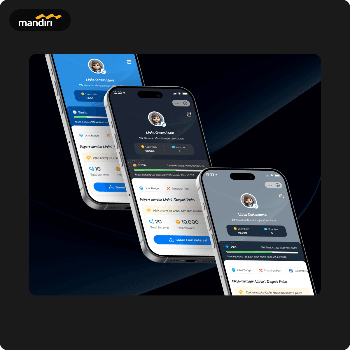Livin' Loyalty is a rewards program for Livin' by Mandiri users, offering perks like points, vouchers, membership tracking, badges, and games. The higher your level, the more benefits you unlock! Personalize your experience by customizing your avatar to fit your style