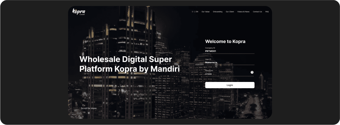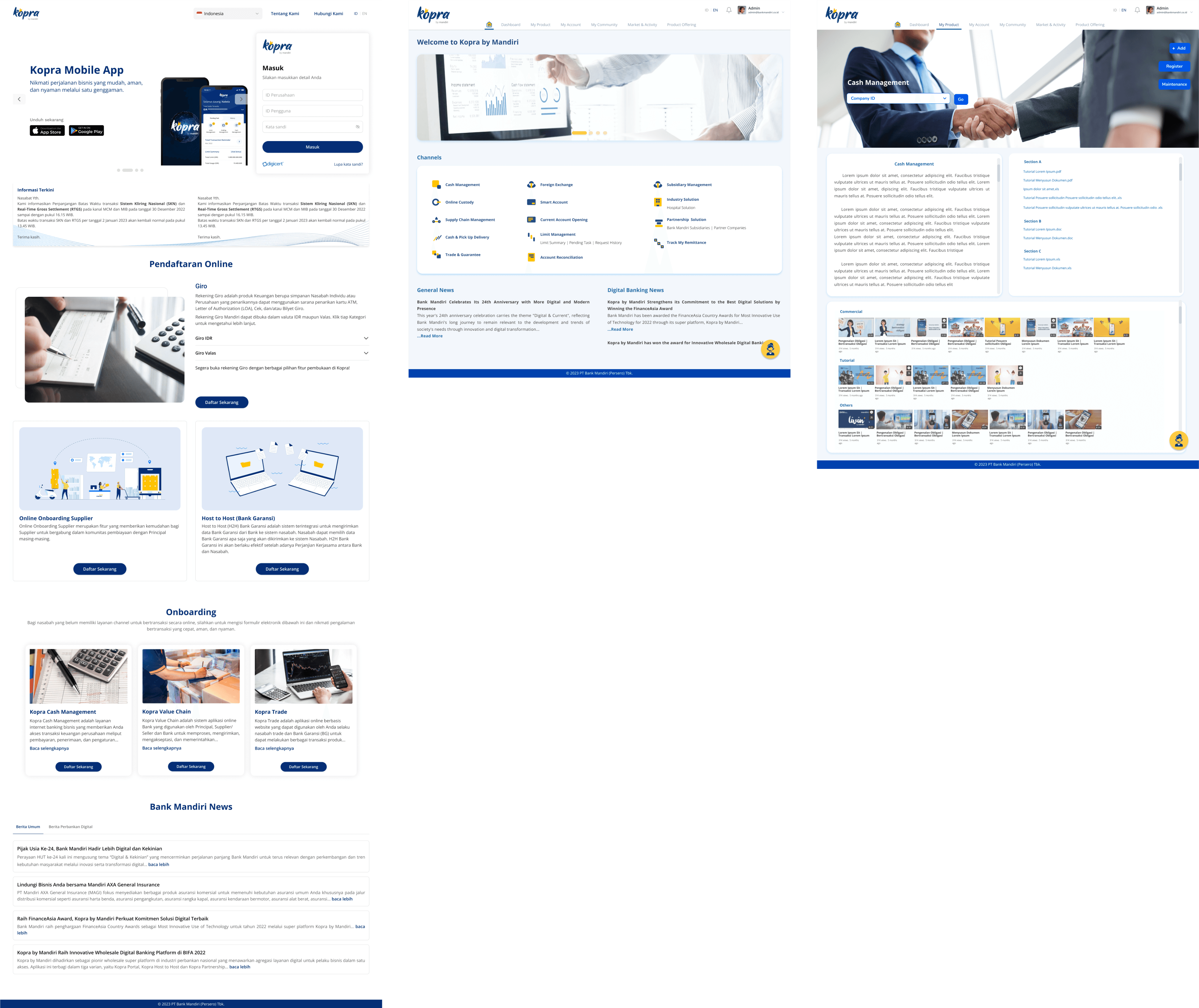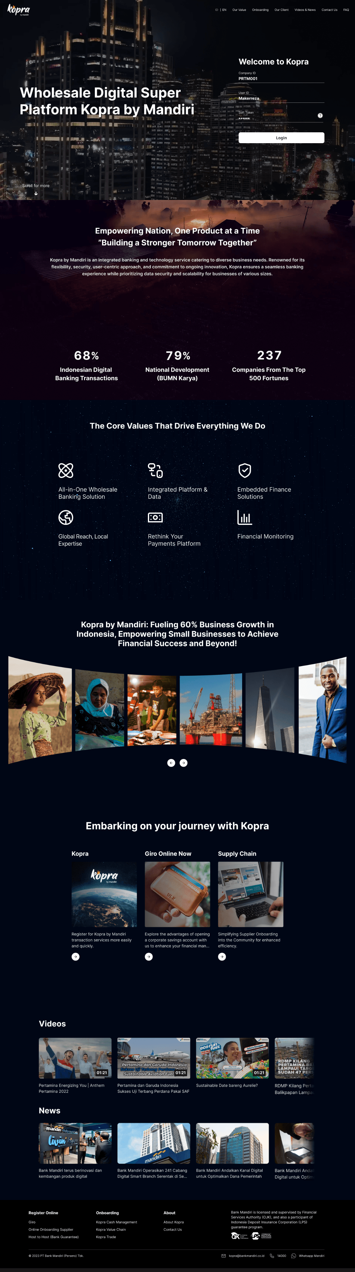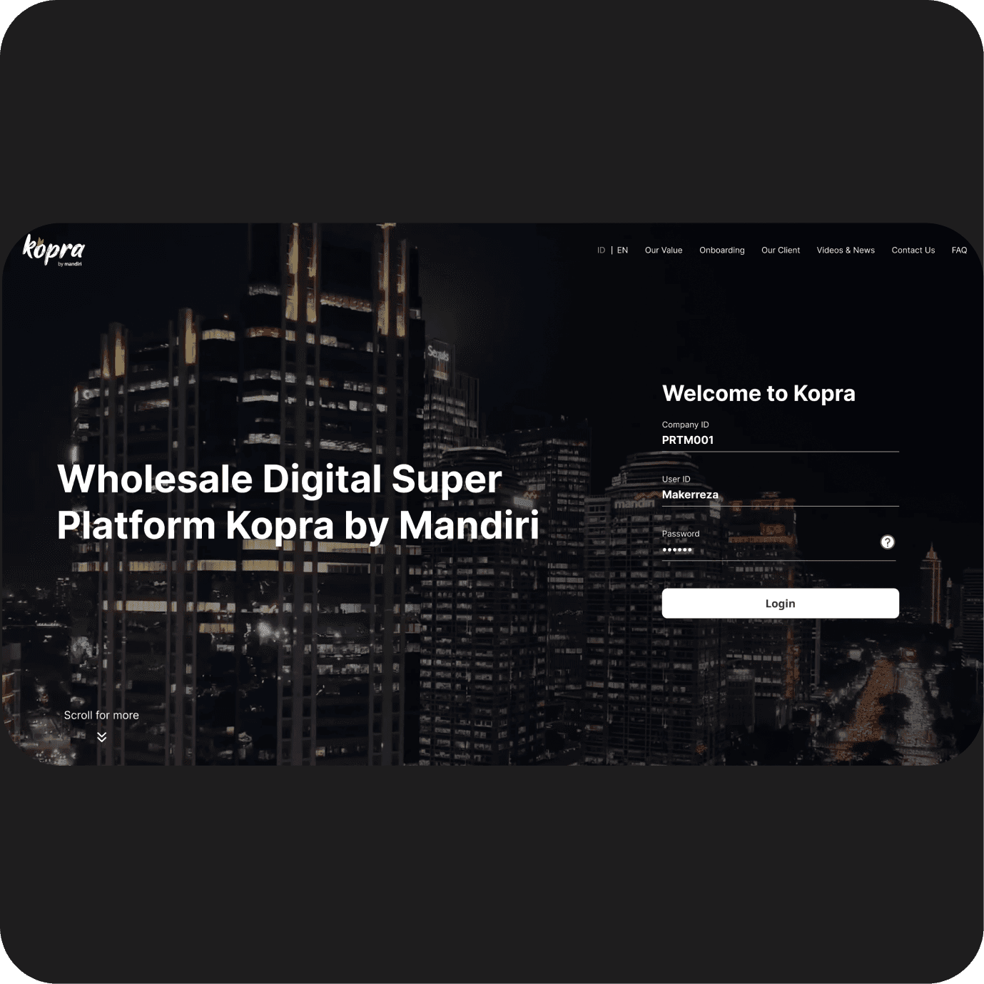 Kopra by Mandiri is Bank Mandiri’s comprehensive wholesale banking service, designed to cater to your business transactions needs for Cash Management, Value Chain and Trade all within a single portal.