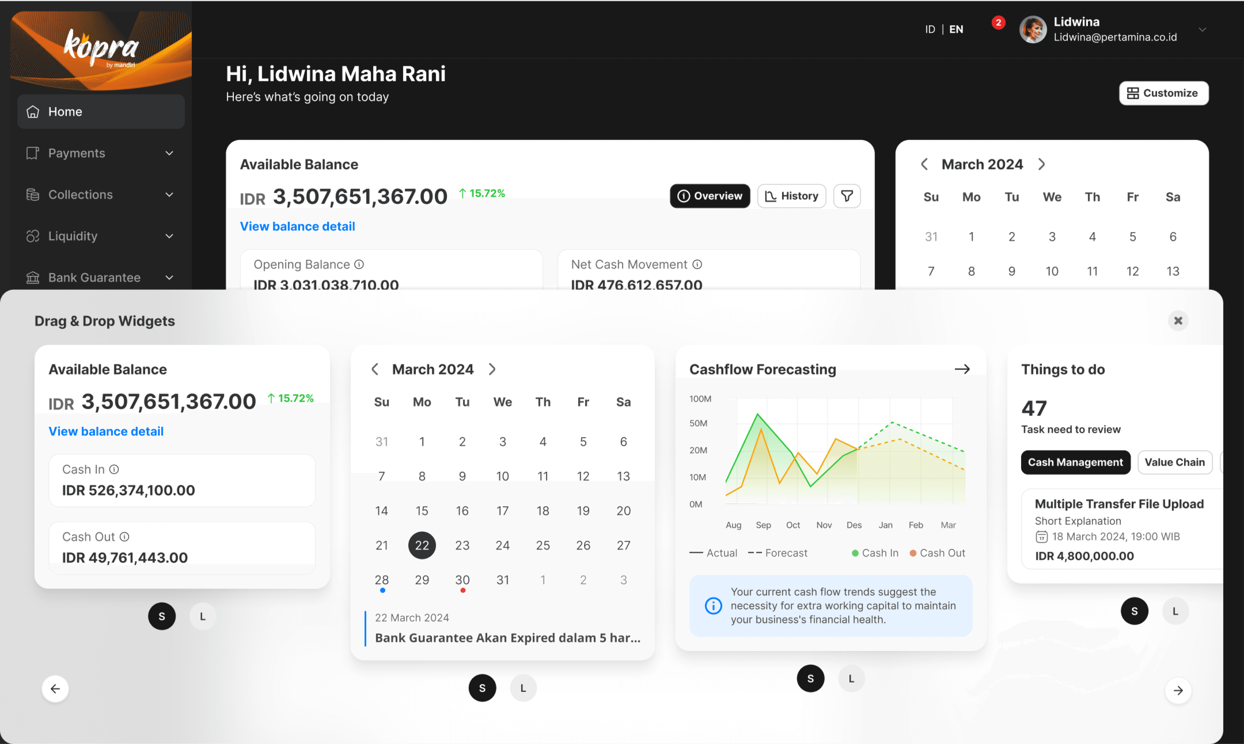 Simplifies invoice distribution and billing through digital channels, complete with automatic reminders (via Kopra or Livin’) and real-time reconciliation—helping accelerate cash flow and reduce manual errors.