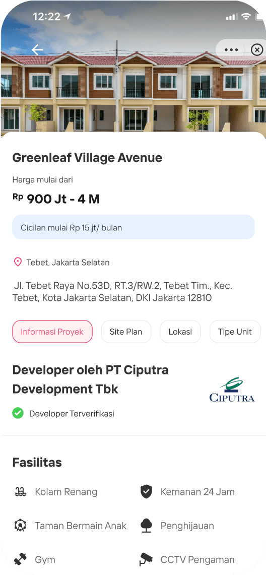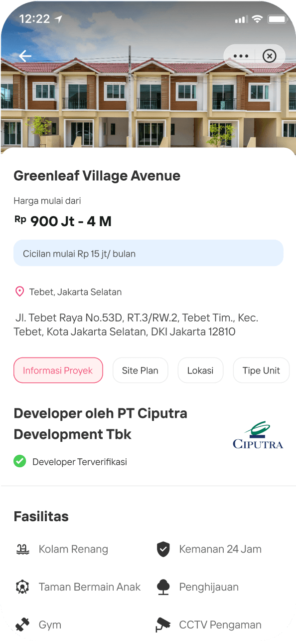 This page presents detailed information about the housing project from the developer, including available units, location, and general facilities